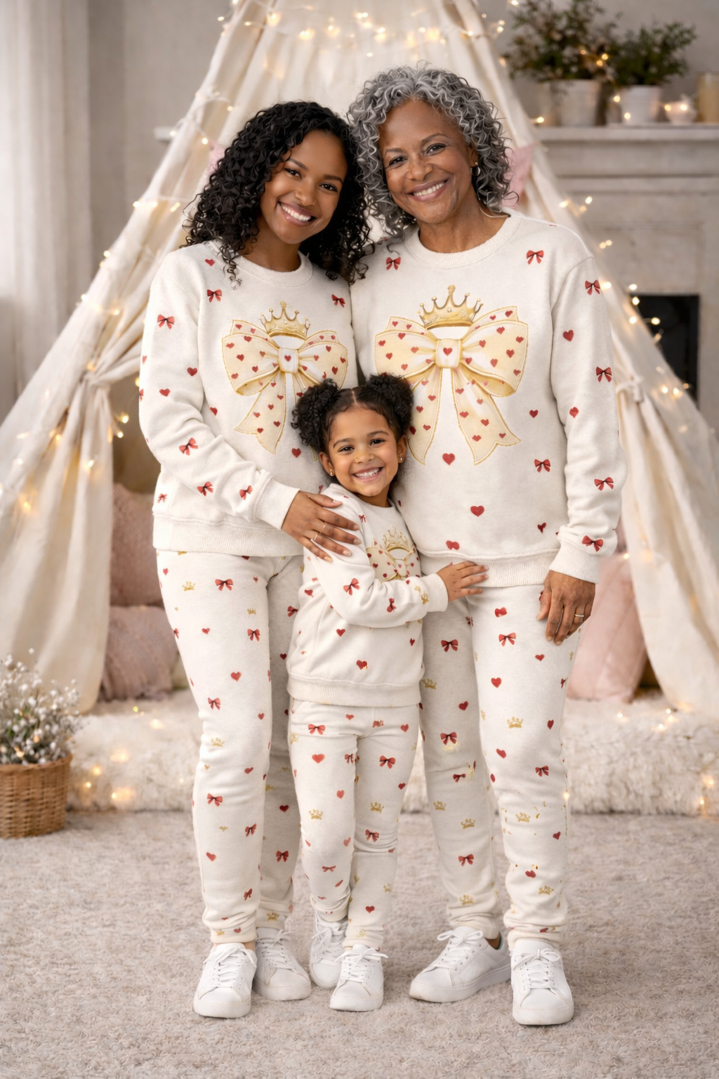 Soft, breathable, and wrapped in Noir Nectar’s signature crown-and-bow Valentine pattern, this matching sweatshirt and leggings set turns an ordinary night into something sacred — laughter echoing through the house, whispered prayers before bed, grateful hearts, and a room glowing with love.